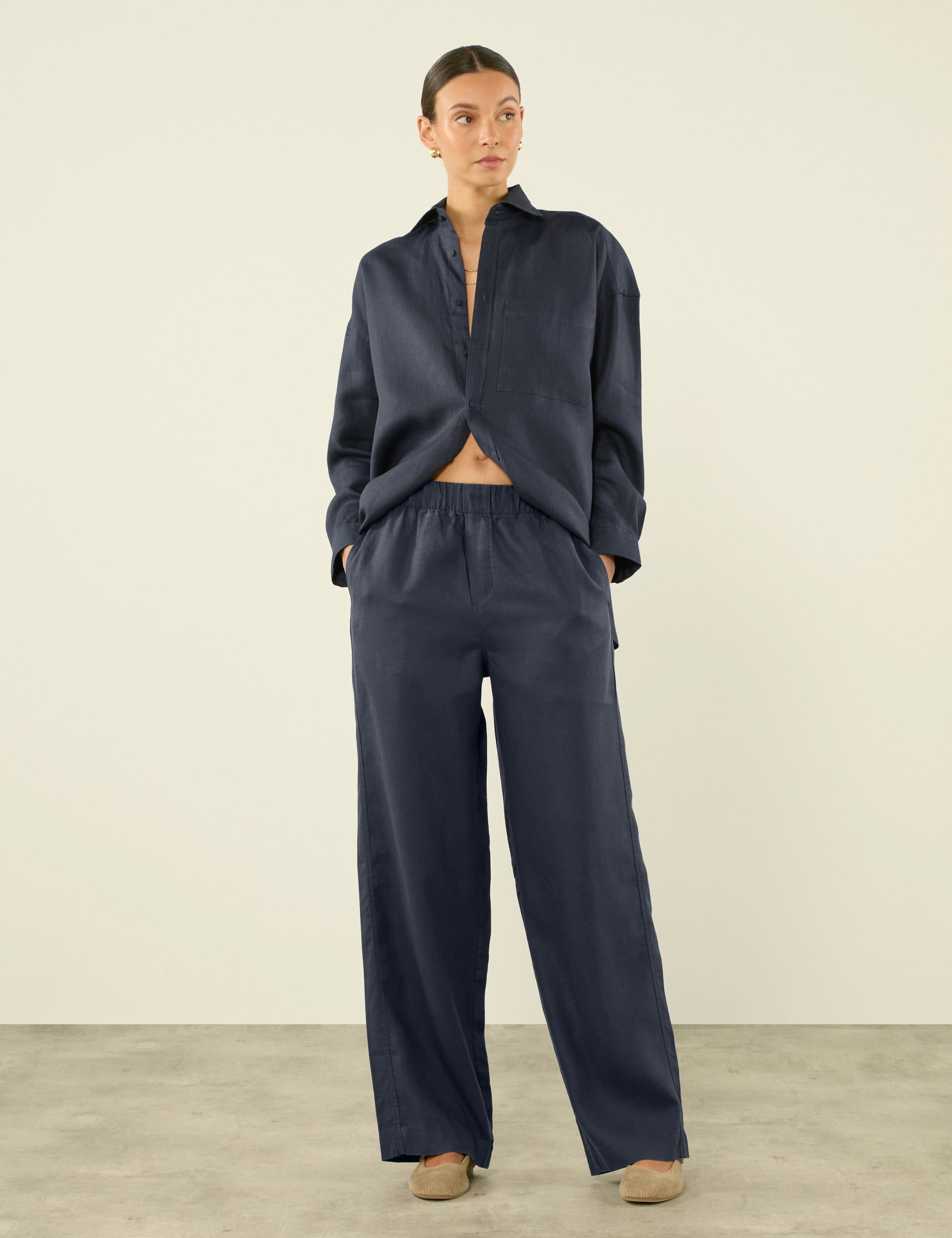 The Palazzo: Hemp, Navy in 100% Hemp. Designed with casual wear in mind, the Palazzo trouser is the perfect easy trouser, made with an elasticated waistband and two pockets. Simply wear as a Co-ord Set with either of the matching shirts, in the Boyfriend or Weekend shapes, or style the relaxed trousers with a lightweight knit and blazer for a play on high low dressing.